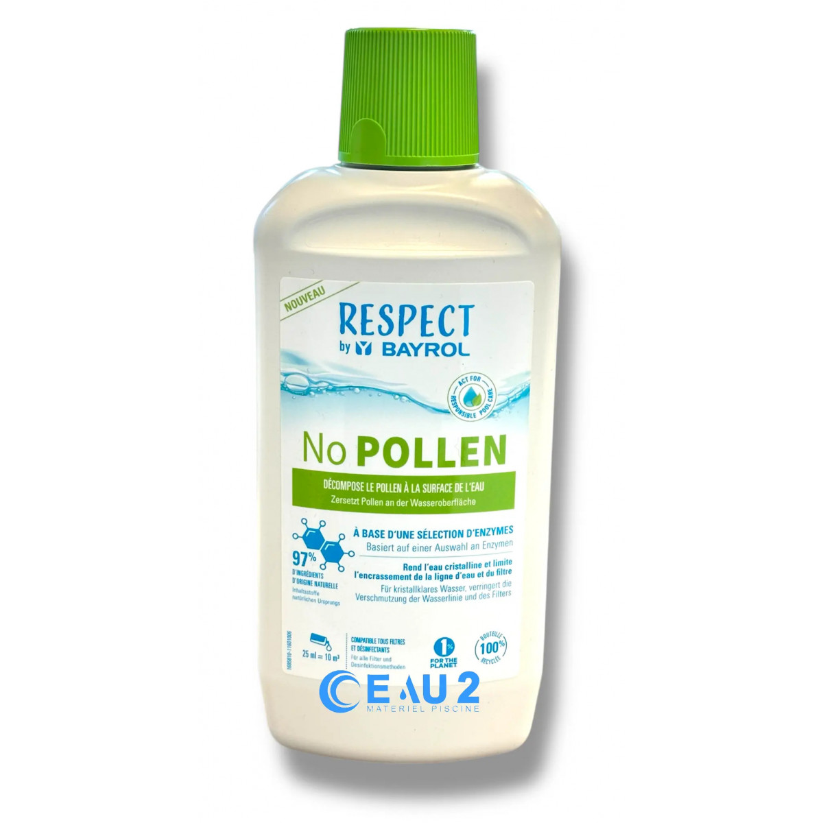 No Pollen Respect by Bayrol est le booster idéal pour le début de saison, rendant l'eau de votre piscine cristalline avec moins d'efforts et réduisant la consommation d'eau. Ce produit innovant décompose naturellement le pollen à la surface de l'eau, réduisant ainsi l'encrassement de la ligne d'eau et du filtre.