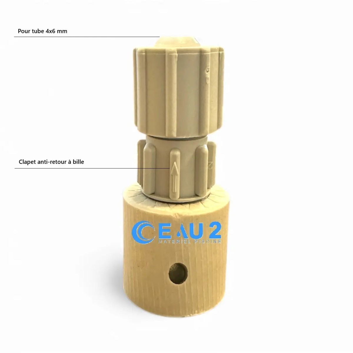 Placée dans le bidon du chlore liquide ou pH moins liquide aspire et grâce à la bille anti-retour le produit reste dans le tube.Vous allez pouvoir raccorder les tubes Cristal, PE etPTFE de diamètre 4x6 mm.